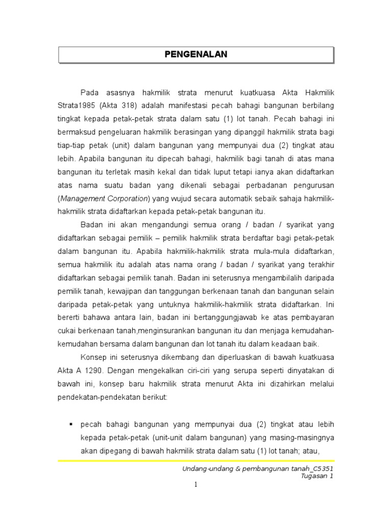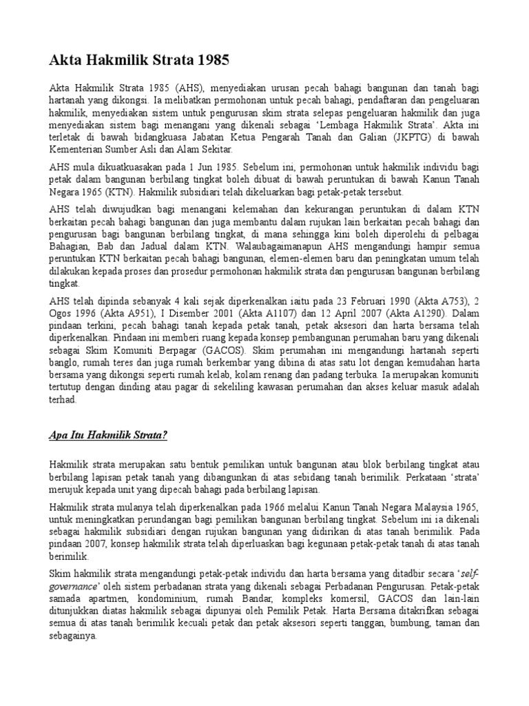 Strata titles act act akta hakmilik strata akta as at 1st september general editor. We would like to show you a description here but the site won t allow us. Akta hakmilik strata 1985 akta 318 3 1 untuk memenuhi keperluan semasa maka digubal satu akta baru dengan mengabung peruntukan mengenai pbb dalam ktn dan menambah beberapa peruntukan baru dalam satu akta yang dikenali sebagai akta hakmilik strata ahs yang berkuatkuasa pada 1 jun 1985.