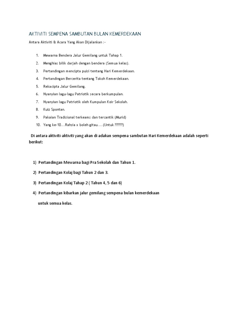 Untuk lebih selamat sekolah perlu batalkan aktiviti yang melibatkan pelajar berkumpul secara ramai. Akibat penularan virus covid 19 sambutan bulan kemerdekaan mungkin sedikit berbeza dari tahun tahun yang lepas. Setiap tahun pelbagai aktiviti dianjurkan untuk menyambut bulan kemerdekaan. Contoh karangan aktiviti menarik yang boleh dijalankan sepanjang bulan kemerdekaan dan hari kebangsaan pendahuluan era pascaperindustrian dan pascaglobalisasi yang serba mencabar akal dan minda kita telah membuatkan masyarakat hari ini lupa dengan sejarah perjuangan nenek dan moyang kita dalam mengecapi kemerdekaan untuk negara.