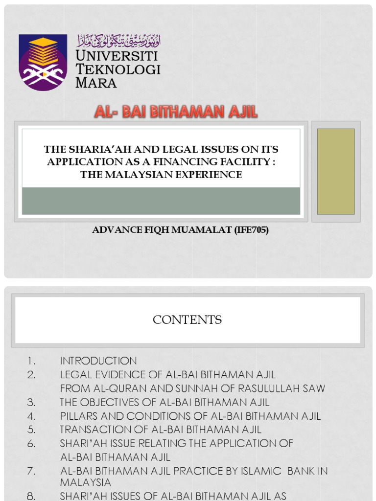 Al bai bithaman ajil. This particular contract has become exceedingly popular in the islamic banking context as will be explored later. Al bai bithaman ajil di kualalumpur pada tahun 1994 al bai bithaman ajil. Property land motor vehicle consumer goods shares overdraft facility education financing evidences package etc. The sale of goods on a deferred payment basis.