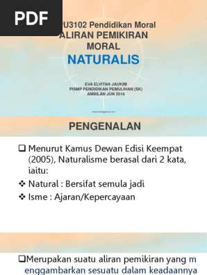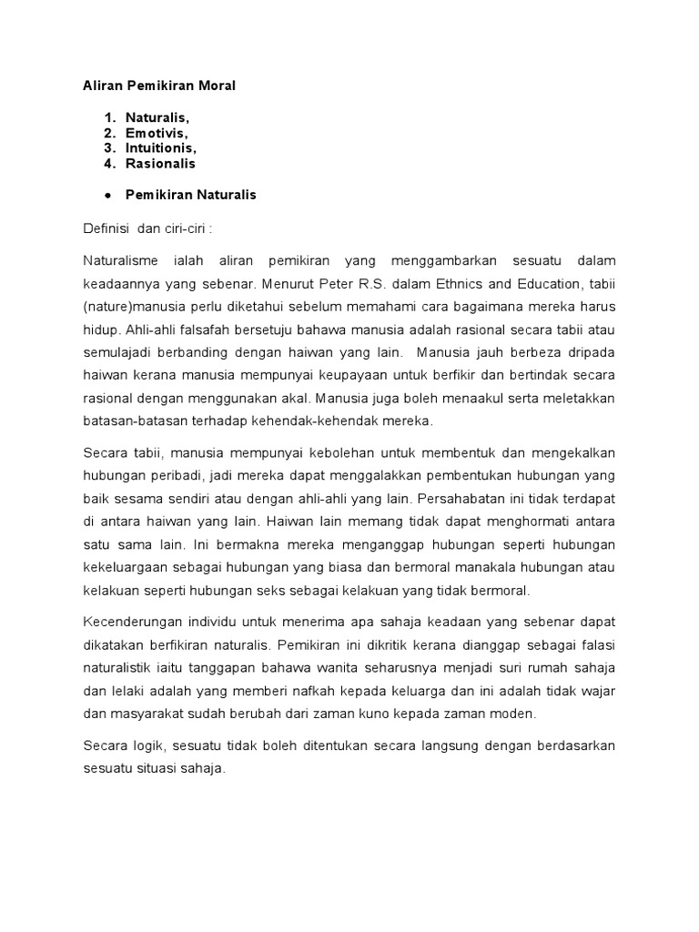 Academia edu is a platform for academics to share research papers. Bagi individu yang yang mengamalkan aliran naturalis cenderung menerima apa sahaja keadaan yang sebenarnya. Emotivis berasal dari perkataan emosi yang merujuk kepada kebangkitan perasaan. 18 secara bahasa moral merupakan bentuk jamak dari kata mos yang bermakna kebiasaan 9 dalam kamus umum bahasa indonesia dikatakan bahwa moral adalah penentuan baik buruk terhadap perbuatan dan kelakuan 10 moral dipahami sebagai ajaran ajaran wejangan wejangan khotbah khotbah dan patokan patokan tentang bagaimana manusia harus.