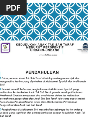 Anak tidak sah taraf pdf. Di dalam kes ini mahkamah telah membuat sabitan bahawa seorang bayi lelaki yang telah dilahirkan oleh farah nurliliana binti jauhari pada 7 disember 2010 adalah anak sah taraf mengikut hukum syarak dan perlu dinasabkan kepada wan khairi bin wan azmi. 3 terhakisnya adab adab ketimuran dan nilai agama apabila tanpa segan silu ber. However scholars have different opinions on a number of associated conditions. Jika yg menyetubuhi ibu tersebut ialah lelaki islam dan ibu tersebut bukan islam ia tidak.