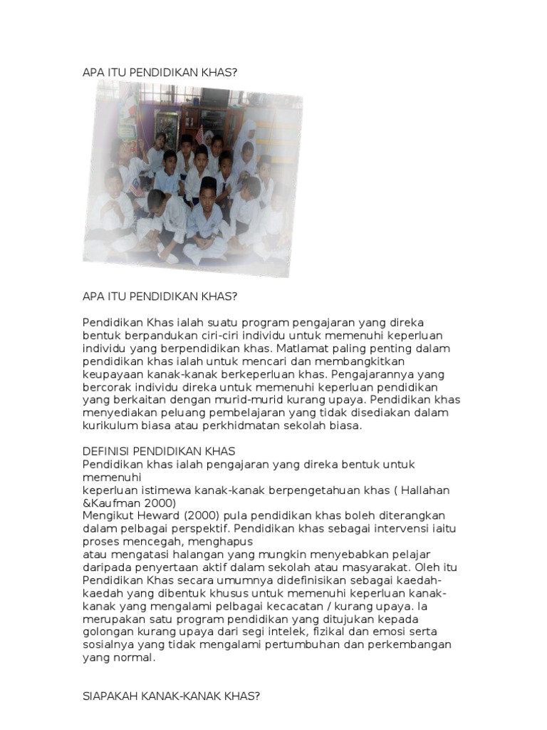 Apa itu pendidikan khas. Untuk memahami apa itu pendidikankhas adalah wajar kita meninjau beberapa definisi yang dikemukankan oleh pakar pakar dalam bidang hallahan dan kauffman 2006. Apa itu pendidikan khas. Apa itu program pendidikan khas integrasi. Program ini telah wujud pada tahun 1988 dan kelas sekolah peringkat menengah dibuka pada tahun 1995.
