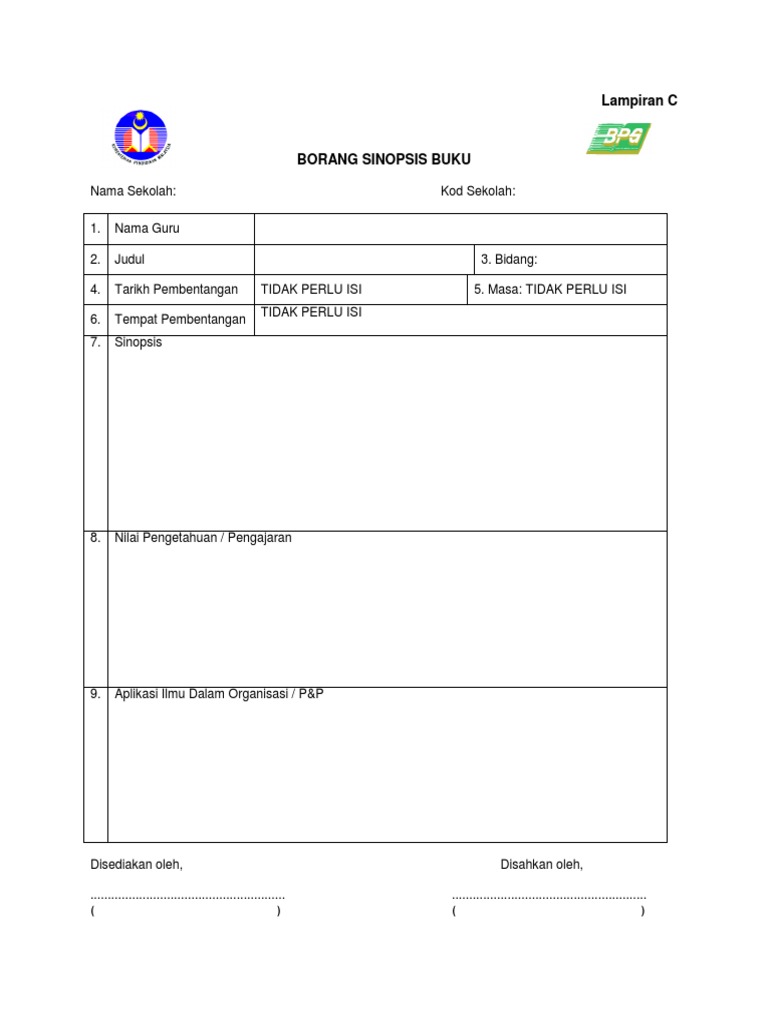 Borang sinopsis buku untuk guru download. Guru guru tidak akan kenal erti penat lelah untuk mencapai kecemerlangan dalam bidang akademik dan kokurikulum. Lampiran c borang sinopsis buku nama sekolah. Minta izin menggunakan perkongsian ini untuk ulasan buku guru kakitangan sekolah kami. Judul intrapersonal dan interpersonal untuk remaja 3.