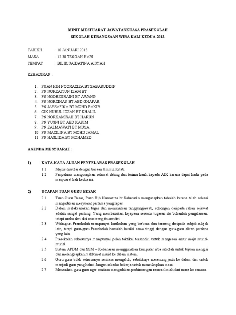 Encik a mencadangkan minit mesyuarat jawatankuasa kurikulum kali 2 disahkan dan en b. Minit mesyuarat kali pertama sememangnya amat payah dilakukan oleh golongan yang tidak selalu bersemuka dengan kerja kerja minit mesyuarat ini berikut merupakan contoh minit mesyuarat buat kali pertama. Contoh minit mesyuarat minit mesyuarat merupakan satu laporan mengenai perkara atau hal yang dibincangkan dan diputuskan dalam sesuatu mesyuarat. Academia edu is a platform for academics to share research papers.