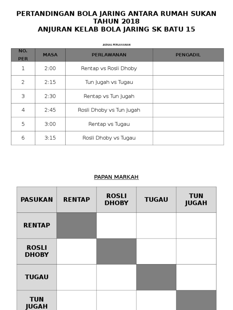 Contoh jadual perlawanan bola jaring. Jadual pertandingan sirkit 4. Contoh jadual pertandingan kalah mati 2. Kongsi ke twitter kongsi ke facebook kongsi ke pinterest. Setiap perlawanan hendaklah dijalankan mengikut masa dan tempat yang telah ditetapkan oleh pihak penganjur.