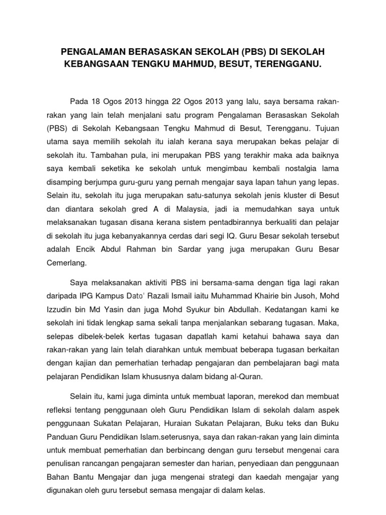 Contoh laporan pengalaman berasaskan sekolah. Diminta menghadiri taklimat refleksi pbs tersebut seperti ketetapan di bawah. Program ini diharapkan dapat memberi kefahaman awal kepada pelajar tentang. Analisis isu perkara yang difokuskan. 30 mac 2010 selasa masa.