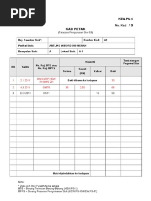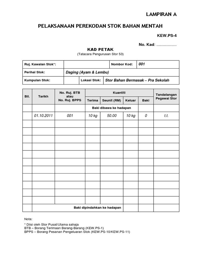 Contoh mengisi borang kew ps 4. Dan ii kad petak kew ps 4 di stor pusat stor utama dan stor unit pindaan atau pemadaman pada rekod tidak dibenarkan. Diisi oleh stor pusat utama sahaja btb borang terimaan barang barang kew ps 1 bpps borang pesanan pengeluaran stok kew ps 10 kew ps 11 46. Klik pada pautan borang yang ingin dimuat turun. 5 2009 tatacara pengurusan stor kerajaan tps setiap agensi perlu melaksanakan pengkelasan kategori stor.