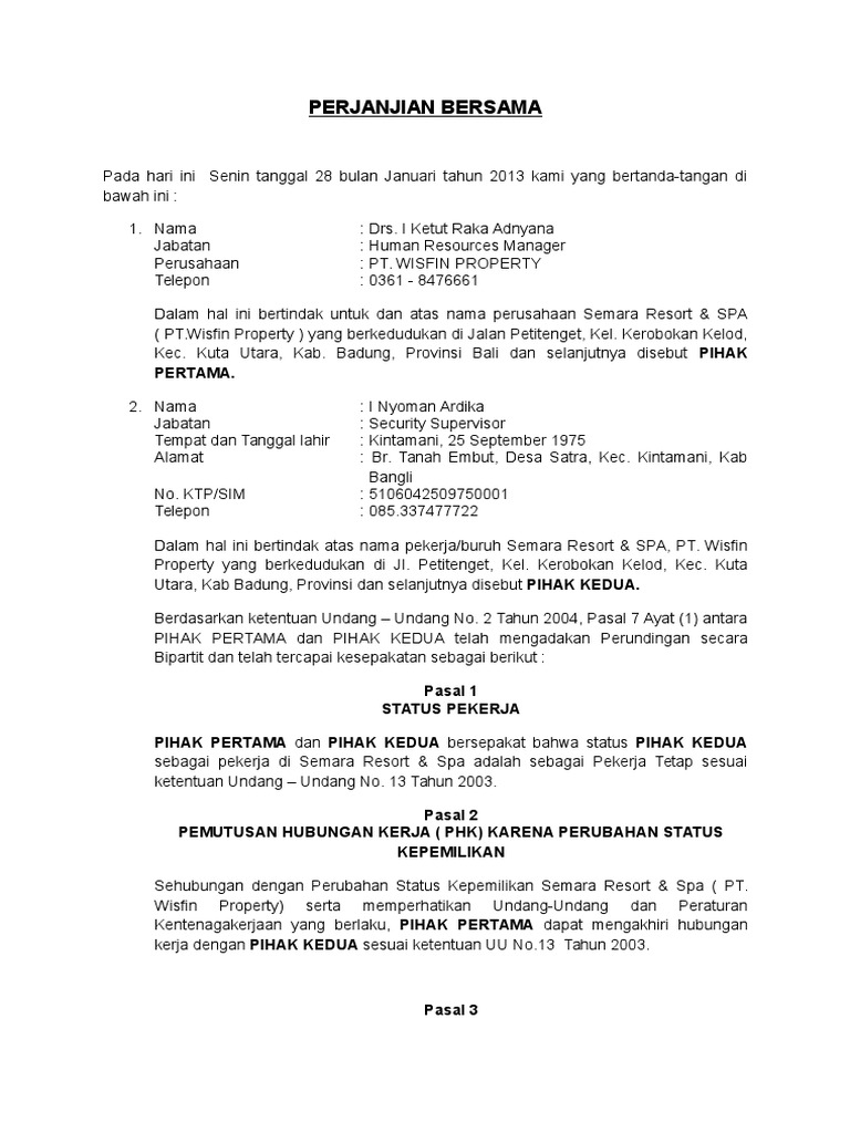 Contoh surat perjanjian bersama phk. Draf kesepakatan bersama pengakhiran perjanjian harga. Dengan telah terjadinya kesepakatan penyelesaian perselisihan secara musyawarah dan mufakat diantara para pihak maka para pihak dengan ini menyatakan tidak akan saling menuntut baik sekarang maupun dikemudian hari baik secara perdata hubungan industrial maupun secara pidana sepanjang berkaitan dengan permasalahan sebagaimana tersebut di atas pada pasal 1 dan perjanjian bersama ini. Admin blog barisan contoh 2019 juga mengumpulkan gambar gambar lainnya terkait contoh surat kesepakatan bersama antara perusahaan dengan karyawan dibawah ini. Selanjutnya pihak pertama membayar sisa total cicilan car ownership program cop yang menjadi tanggungan pihak pertama sebesar rp.