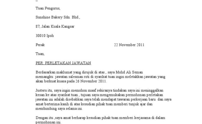 7 jalan 1 46a selingsing 7 taman niaga waris. Antaranya ialah surat letak jawatan 24 jam letak jawatan dalam masa 30 hari dan sebagainya. En adam syahmi perletakan jawatan sebagai eksekutif teknikal. Selain itu surat berhenti kerja juga membantu anda mengekalkan hubungan yang positif antara pekerja dengan bekas majikan dan menunjukkan sikap professional.