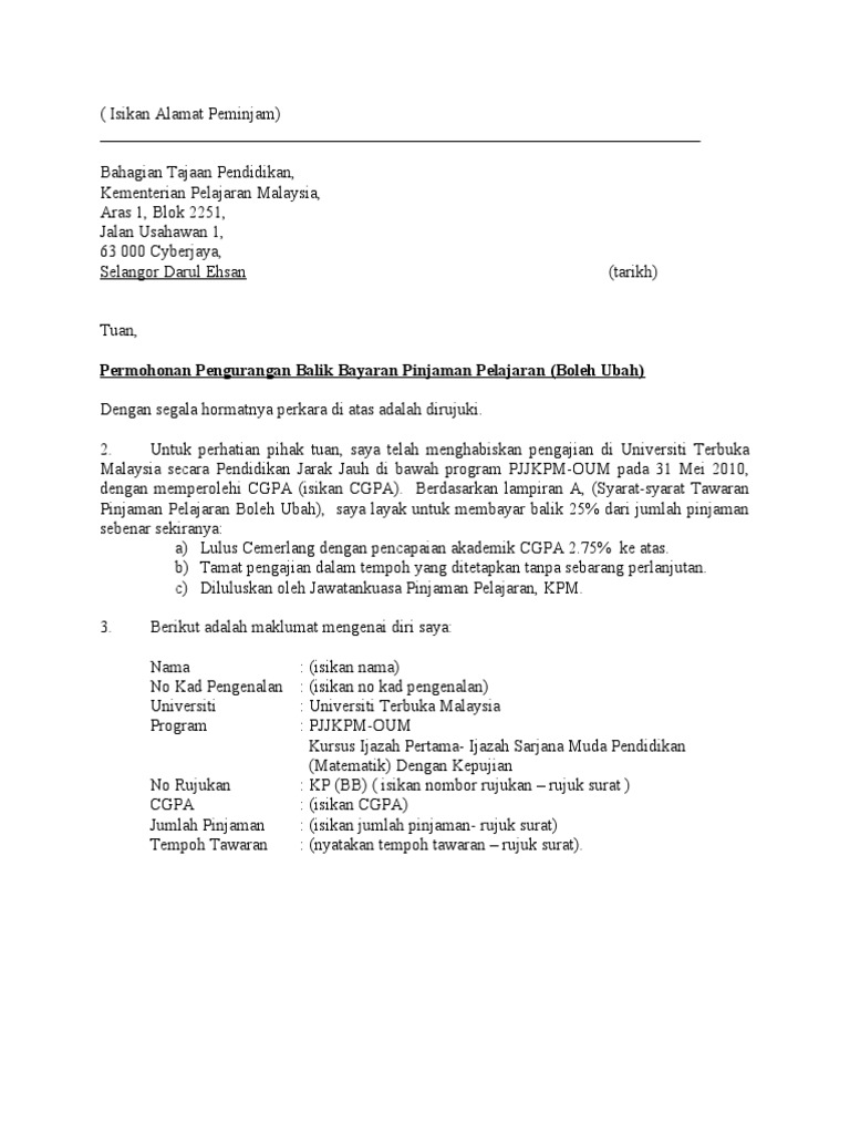 Contoh surat rayuan pengurangan bayaran penuh pinjaman bank. Contoh surat rayuan menangguhkan bayaran ptptn jika anda mengalami masalah untuk menyelesaikan bayaran ptptn anda seperti yang ditetapkan dalam surat tawaran pinjaman anda boleh menulis surat rayuan untuk menangguhkan bayaran tersebut. Contoh surat rayuan pengurangan bayaran mara online contoh surat rayuan pengurangan bayaran pinjaman bank contoh surat rayuan pengurangan bayaran saman contoh surat rayuan pengurangan bayaran ptptn contoh surat rayuan pengurangan pinjaman bank contoh surat rayuan pengurangan bayaran cukai pendapatan. Contoh surat rayuan pengurangan bayaran cukai pendapatan contoh surat rayuan pengurangan bayaran pinjaman bank contoh surat rayuan pengurangan bayaran ptptn contoh surat rayuan pengurangan bayaran balik pinjaman contoh surat rayuan pengurangan bayaran pinjaman. Saya juga memohon supaya bayaran pinjaman dikurangkan sehingga situasi pendapatan saya stabil.