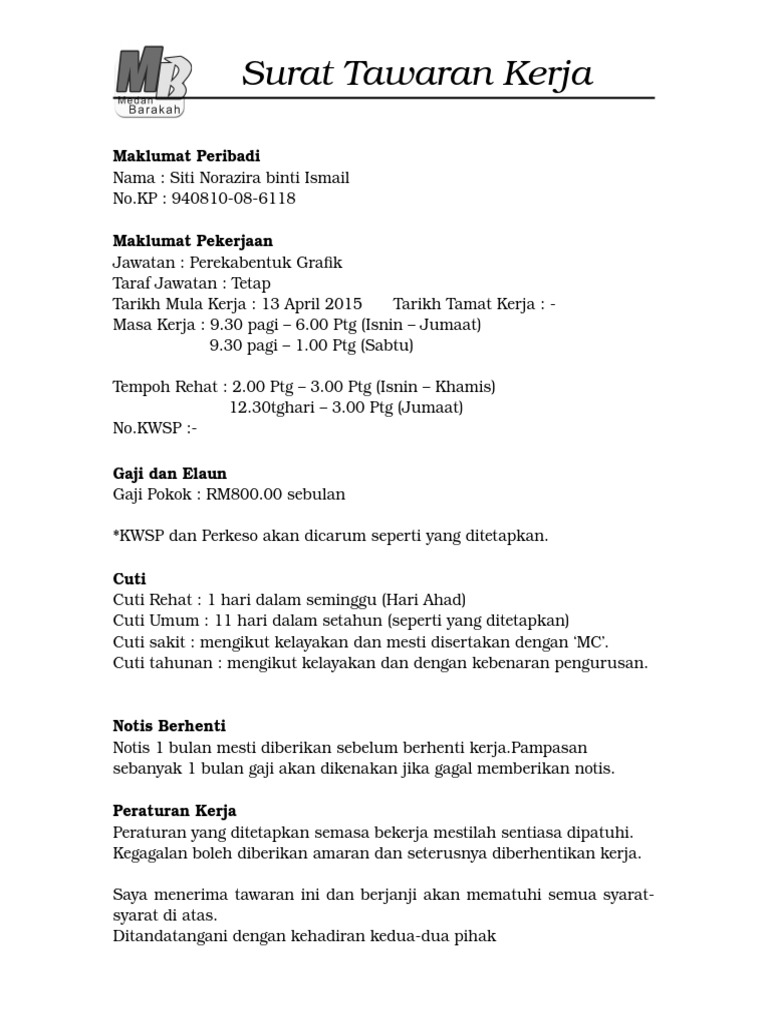 Contoh surat tawaran kerja dari majikan swasta. Kami percaya bahawa pengetahuan kemahiran dan pengalaman anda akan menjadi antara aset kami yang paling berharga dan kehadiran anda ke dalam organisasi ini amat dialu alukan. Surat tawaran kerja adalah dokumen bertulis formal yang dihantar oleh majikan kepada calon pekerjaan yang dipilih untuk pekerjaan. Standard surat tawaran kerja ini menggunakan kategori standard yang meliputi kebanyakan jawatan daripada pekerja pengeluaran kepada pengarah. Contoh surat tawaran kerja surat lamaran kerja dibutuhkan guna melamar pekerjaan baru untuk kamu yang baru lulus kuliah pindah kerja cari suasana baru maupun fresh graduate.
