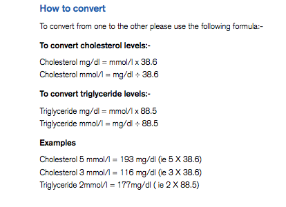 You should never use something from the internet as a replacement for your doctor or pharmacists advice. Mmol l to mg dl converter. To convert from mg dl to mmol l multiply by 0 01129. Mmol l µmol l mg dl mg 100ml mg mg l µg ml cholesterol is a steroid with a secondary hydroxyl group in the c3 position.