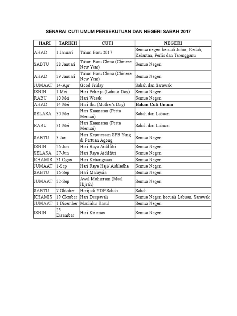 Berikut adalah kalendar dan senarai cuti umum hari kelepasan am dan cuti sekolah di malaysia untuk 2017. Cuti awal muharram 2017 ditukar tarikh dari 21 september ke 22 september. Perubahan tarikh awal muharam khamis 21 9 ke jumaat 22 9 2017.