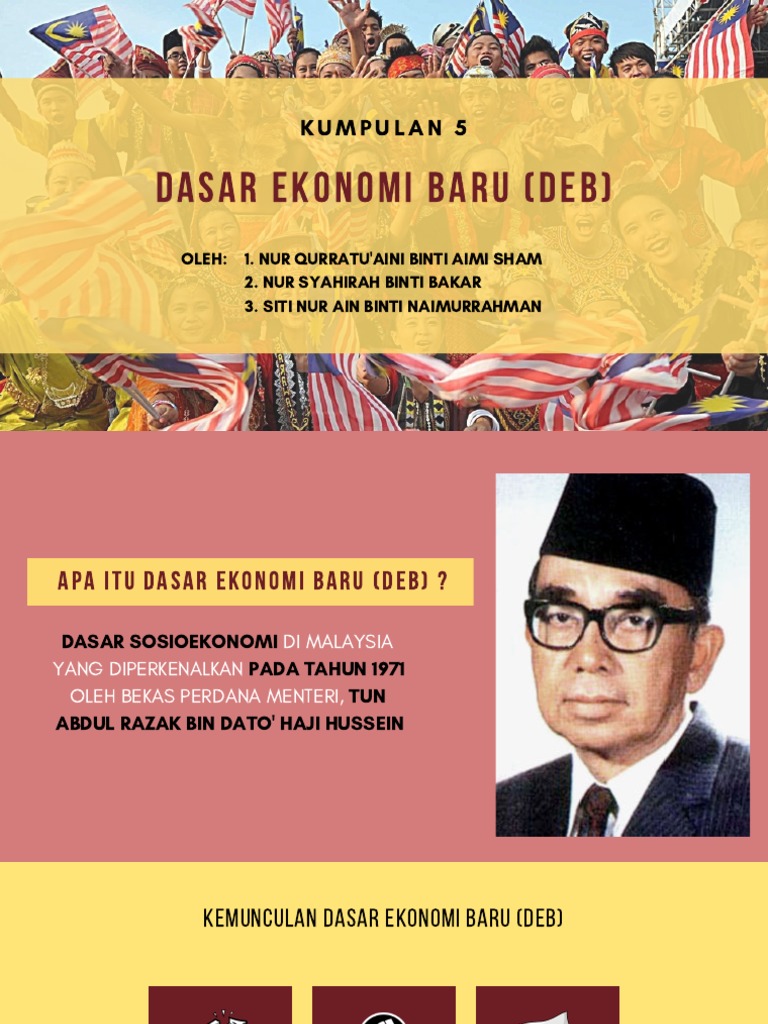 Dasar ekonomi baru deb pada tahun 1971. Matlamat tersurat deb adalah untuk mencapai perpaduan negara dan integrasi nasional dan ia telah digubal dalam konteks strategi serampang dua mata untuk. Pada tahun 1970 49 3 daripada penduduk malaysia hidup di bawah garis kemiskinan yang meliputi 64 8 masyarakat bumiputera 39 2 masyarakat india dan 26 0 masyarakat cina. D asar ekonomi baru deb merupakan dasar yang diperkenalkan oleh tun abdul razak iaitu perdana menteri malaysia kedua pada tahun 1970 selepas negara dikejutkan dengan peristiwa 13 mei 1969. Kerajaan telah membentuk dasar ekonomi baru deb yang menjadi satu rangka rancangan panjang mencakupi tempoh selama 20 tahun 1970 1990.