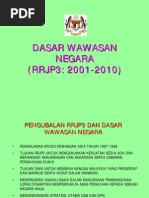 Dasar wawasan negara. Dasar wawasan negara yang terkandung dalam rrjp3 berperanan menentukan arah pembangunan negara dalam dekad pertama abad ke 21. Objektif utama wawasan 2020 adalah membentuk malaysia sebagai sebuah negara maju dalam seluruh aspek kehidupan sama ada dalam bidang ekonomi politik sosial kebudayaan mahupun kemajuan dalam jiwa rakyat malaysia. Wawasan 2020 ialah sebuah wawasan kerajaan yang pada ketika itu di pimpin oleh tun dato dr mahathir pada ketika itu ia bertujuan untuk meningkatkan malaysia menjadi sebuah negara perindustrian dan negara maju sepenuhnya menjelang tahun 2020 yang dimaksudkan dengan wawasan 2020 adalah bukan sahaja dalam bidang ekonomi tetapi juga bidang bidang politik sosial kerohanian psikologi serta juga.
