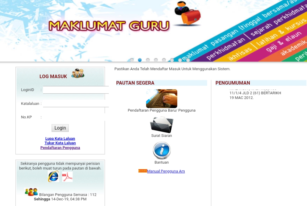 Sistem maklumat prasekolah smpk sistem semakan urusan kenaikan pangkat secara online. Sistem operasi data e operasi modul penilaian prestasi pegawai perkhidmatan pendidikan e prestasi sistem perakaunan kumpulan wang sekolah espkws sistem maklumat institusi pendidikan swasta smips sistem epangkat. Sementara itu manual e operasi boleh dicapai disini sila gunakan kan pelayar browser internet explorer ie 7 ke atas mozilla firefox 3 0 18 ke atas atau chrome dengan paparan 1024 x 768. Semua bahagian sektor operasi pendidikan iaitu bahagian pendidikan teknik dan vokasional bahagian sukan bahagian kokurikulum dan kesenian serta bahagian pengurusan sekolah berasrama penuh dan sekolah kecemerlangan perlu memastikan maklumat guru adalah sahih tepat dan terkini.