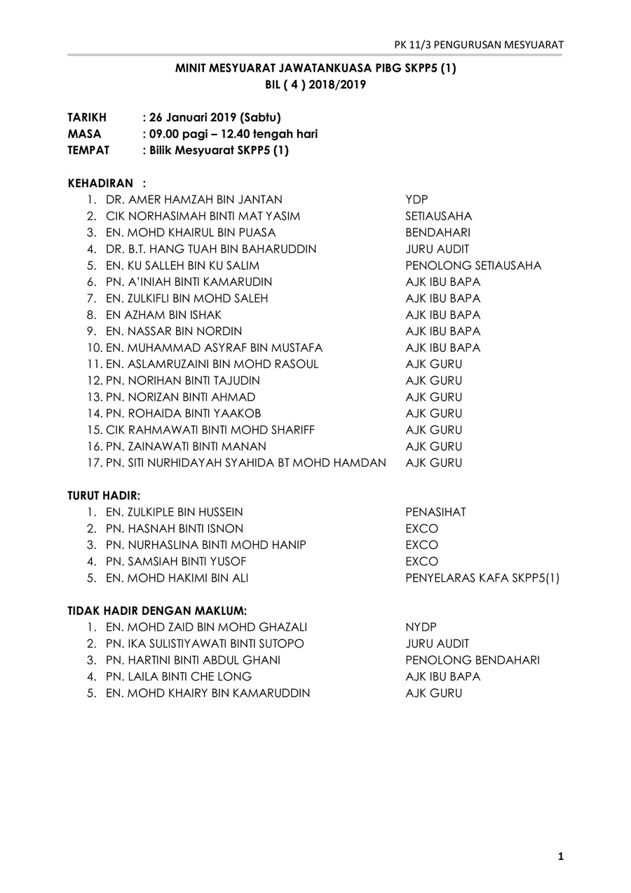 Untuk melihatkan sendiri contoh format minit mesyuarat terkini boleh semak pada pautan gambar di bawah ini contoh format terkini format tidak terlalu berbeza tidak kira anda mesyuarat anda adalah mesyuarat panatia subjek mesyuarat pibg meeting kokurikulum mesyuarat sukan mesyuarat unit bimbingan dan kaunseling ataupun untuk mesyuarat jawatankuasa kurikulum lebih kurang sama sahaja. Pn hjh haslina binti mohamed pengerusi pengetua 2. 06 januari 2019 ahad masa. Bilik gerakan seri intan 2 pengerusi.
