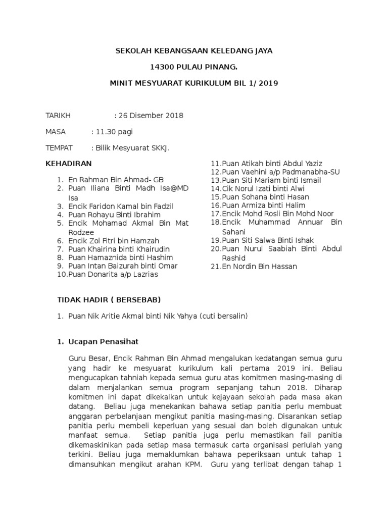Untuk melihatkan sendiri contoh format minit mesyuarat terkini boleh semak pada pautan gambar di bawah ini contoh format terkini format tidak terlalu berbeza tidak kira anda mesyuarat anda adalah mesyuarat panatia subjek mesyuarat pibg meeting kokurikulum mesyuarat sukan mesyuarat unit bimbingan dan kaunseling ataupun untuk mesyuarat jawatankuasa kurikulum lebih kurang sama sahaja. Iklan di sini minit mesyuarat minit mesyuarat pula hendaklah mengikut format yang betul berdasarkan panduan yang dikeluarkan oleh. Format minit mesyuaratbil perkara tindakan1 0 aluan pengerusi perutusan pengerusi makluman ahli2 0 pengesahan minit mesyuarat bil. Ii format penyediaan minit mesyuarat.