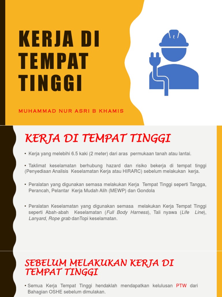 Hazard risiko bekerja di tempat tinggi seluruh dunia dilaporkan lebih 40 000 kecederaan dan kematian disebabkan terjatuh dari tempat tinggi. Tempat kerja adalah. Garis panduan bekerja di tempat tinggi 1 0 tujuan garis panduan ini disediakan bertujuan untuk memberi panduan pemahaman dan rujukan kepada setiap individu atau kontraktor yang dilantik bagi melakukan kerja kerja di tempat tinggi di dalam kawasan universiti tun hussein onn malaysia. Intensitas sumber cahaya efisiensi efektivitasnya keadaan lingkungan tempat kerja.