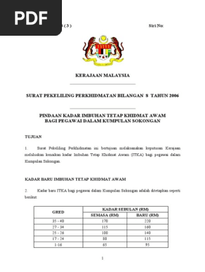Kadar baru itka bagi pegawai dalam kumpulan sokongan adalah ditetapkan seperti berikut. Imbuhan tetap khidmat awam dan imbuhan tetap keraian tarikh ubahsuai. Sebelum itu pegawai dibayar imbuhan tetap khidmat awam atas kadar rm300 00 sebulan. Secara ringkasnya pekeliling ini bertujuan melaksanakan keputusan kerajaan meluluskan kenaikan kadar imbuhan tetap khidmat awam itka bagi pegawai dalam kumpulan sokongan.