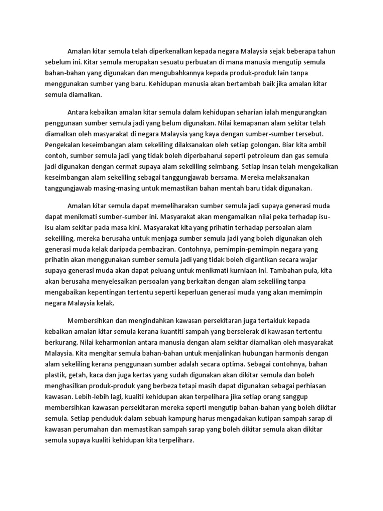 Baca berulang kali bagi memastikan ketepatan karangan kamu. 24 minit menulis karangan c. Tulis ulasan tentang proses kitar semula beg plastic terpakai tersebut dalam bentuk perenggan. Antara kempen kempen yang boleh dilakukan ialah kempen cintailah sungai kita kempen kitar semula sahabat alam dan sebagainya dalam kempen kempen ini masyarakat akan didedahkan tentang pentingnya menjaga alam sekitar dan cara cara menjaga alam sekitar seperti menguruskan sisa pembuangan supaya kurang memberi pencemaran kepada alam sekitar.