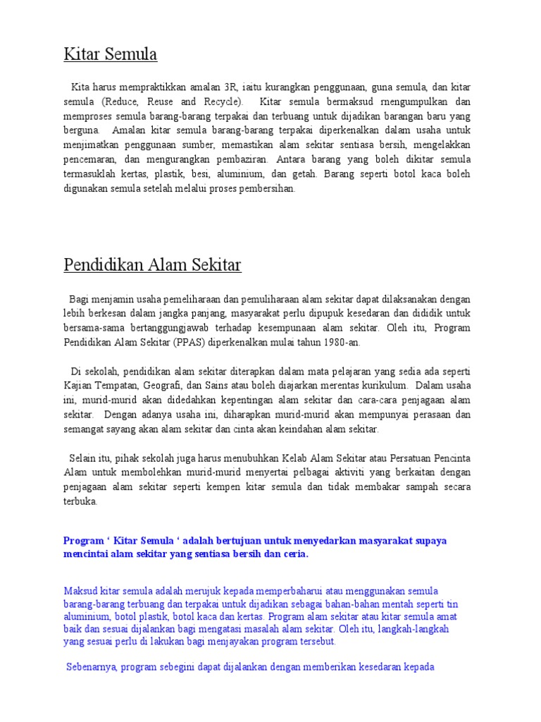 Ba sebanyak 40 peratus sampah sarap seperti tin besi buruk botol kertas dan barangan plastik boleh dikitar semula. Ipendidikan karangan kebaikan dan kepentingan amalan kitar semula kepada manusia disemak dan dikemaskini pada pukul 2 07 pm 11 oktober 2020 penulisan karangan bahasa melayu menguji kebolehan para pelajar dalam memberikan idea yang bernas dan penggunaan bahasa melayu yang betul serta tepat. 2019 upsr bahasa melayu ulasan karangan bonus ulasan 1. Kitar semula juga dapat menambah pendapatan kita.