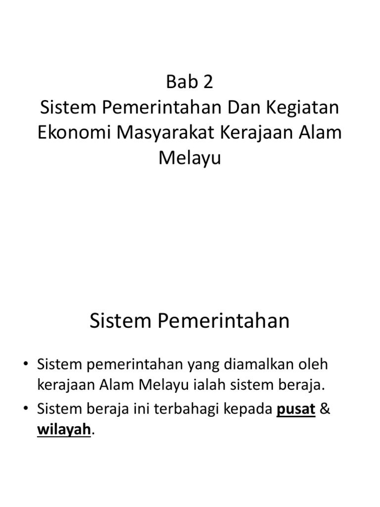 Sistem pemerintahan dan kegiatan ekonomi masyarakat kerajaan alam melayu.