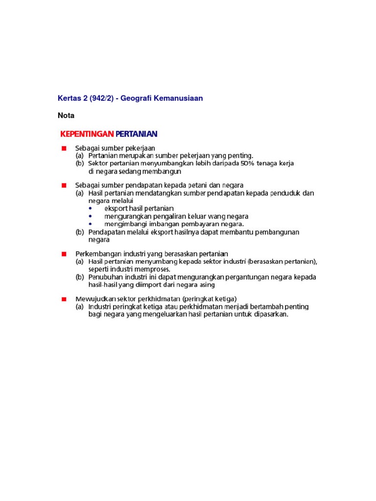 Kepentingan sektor pertanian kepada negara karangan spm. Contoh karangan spm kepentingan sektor pertanian kepada negara sektor pertanian yang merupakan sektor ekonomi primer amatlah penting dari segi kepentingan sosial ekonomi dan ekologi. Menuju wawasan 2020 yang merupakan impian dan visi semua rakyat malaysia untuk menjadi sebuah negara perindustrian yang maju kepentingan sektor pertanian tidak harus dikesampingkan malah perlu dibangunkan agar seiring dengan sektor perindustrian. Menuju wawasan 2020 yang merupakan impian dan visi semua rakyat malaysia untuk menjadi sebuah negara perindustrian yang maju. Pertanian dilihat sebagai perniagaan yang memberi prospek besar kepada seluruh masyarakat malaysia membantu merapatkan jurang sosial ekonomi dalam masyarakat dan turut menyumbang kepada pertumbuhan ekonomi negara.