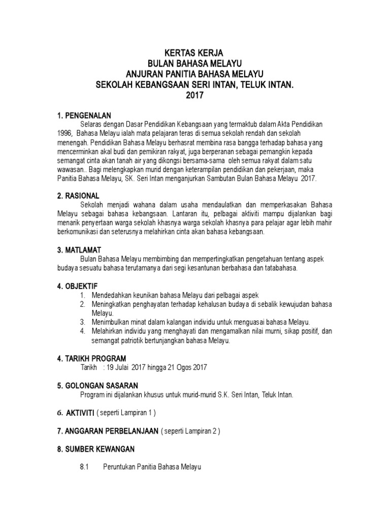 Bermula dengan panggilan minggu bahasa kebangsaan dana bulan bahasa kebangsaan sepanjang dekad 60 an. Kertas kerja keceriaan kantin. Kertas kerja pertandingan bercerita bahasa melayu peringkat sekolah pengenalan. Selaras dengan dasar pendidikan kebangsaan yang termaktub dalam akta pendidikan 1996 bahasa melayu ialah mata pelajaran teras di semua sekolah rendah dan menengah.