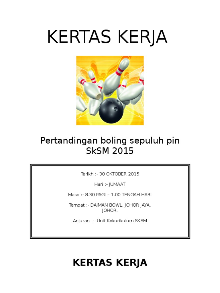 Kertas kerja pertandingan bowling. Sekolah menengah kebangsaan batu sapi. 1 1 10 pendaftaran pertandingan lapor diri semua peserta mesti melaporkan diri 30 minit sebelum pertandingan dimulakan. Disamping itu pertandingan ini dapat mencungkil bakat bakat baru dalam diri insan insan yang pada asalnya mempunyai sikap rendah diri. Pengelola pertandingan bowling ini dalam tempoh masa 30 min selepas sesuatu acara berserta bayaran rm 200 00 secara tunai yang tidak akan dikembalikan.