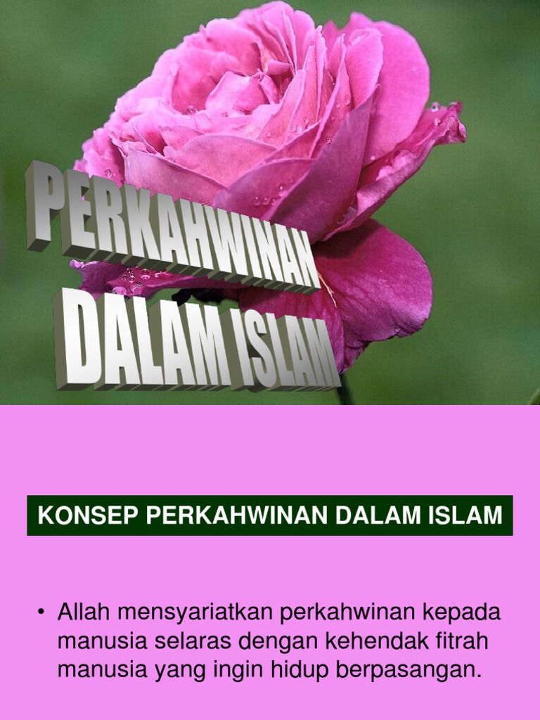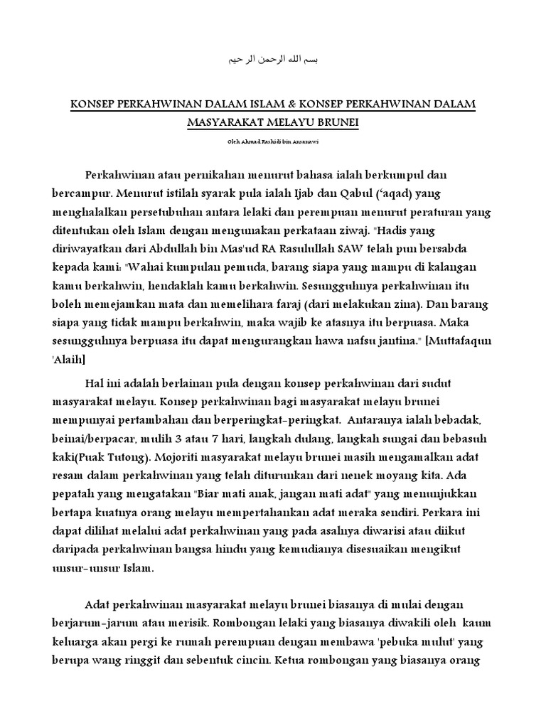 4 4 konsep perkahwinan dalam islam dalam islam perkahwinan adalah suatu ibadat dan sunnah rasulullah s a w. Perkahwinan juga dianggap sebagai langkah permulaan kepada pembentukan keluarga. Perkahwinan dalam islam adalah suatu yang sangat dituntut kerana ia adalah sunnah nabi saw. Perkahwinan merupakan instrumen prelimenari primer kepada pembinaan keluarga sebagai unit asas dan tunjang sesebuah masyarakat.