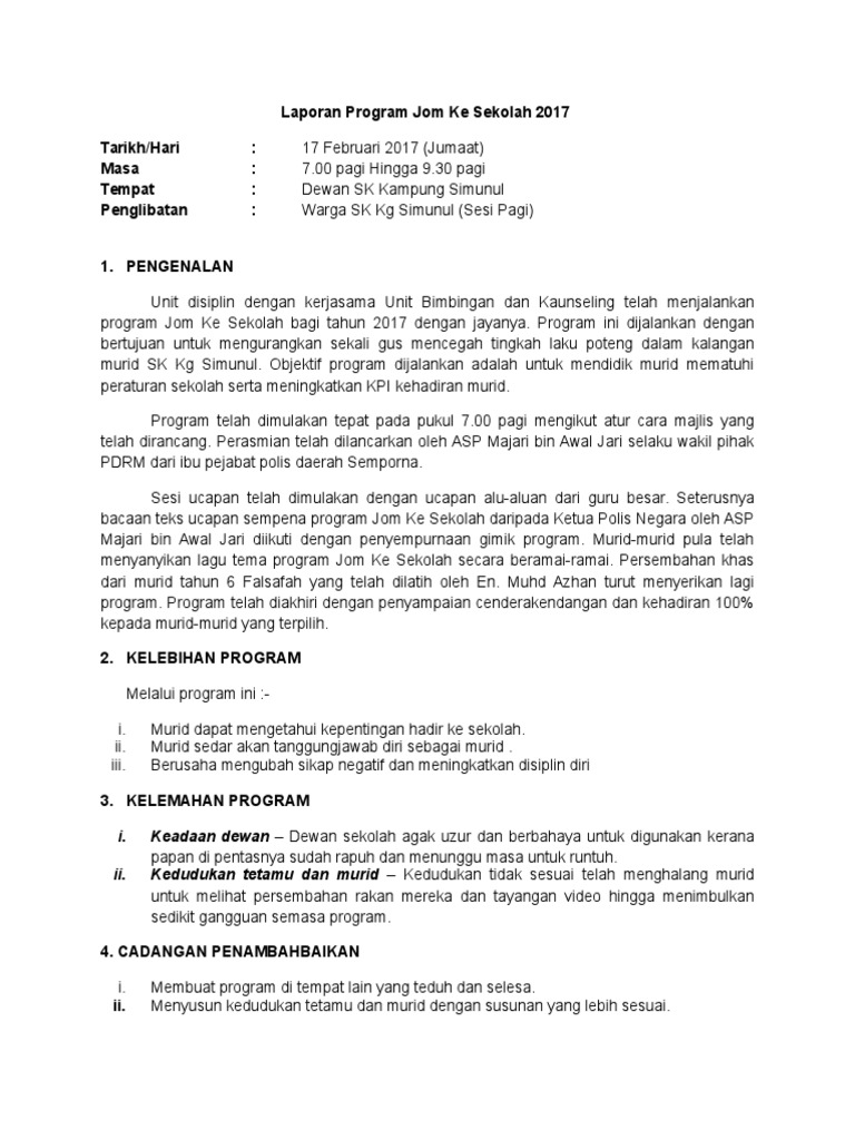 Laporan program jom ke sekolah. Program jom ke sekolah adalah merupakan program kolaboratif antara kementerian pendidikan malaysia dan polis diraja malaysia pdrm dalam usaha menangani permasalahan disiplin dan salah laku murid. Laporan pelancaran prorgam jom ke sekolah sk sungoi. Tarikh hari. 7 30 pagi 9 00 pagi.
