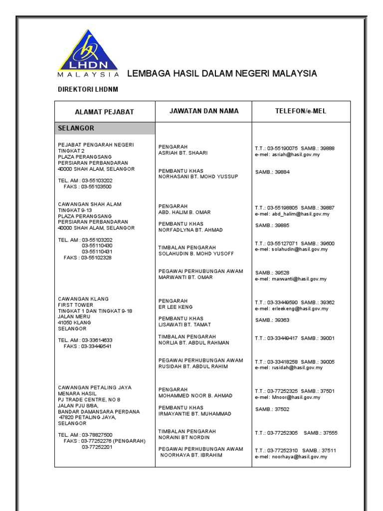 Lembaga hasil dalam negeri selangor. 150 tarikh kemaskini. 603 8313 7848 603 8313 7849 e mel. Paparan terbaik menggunakan pelayar chrome internet explorer versi terkini atau mozilla firefox dengan resolusi skrin 1280x800. Lembaga hasil dalam negeri malaysia irbm directory office address name and designation telephone e mail selangor director amnah bt.