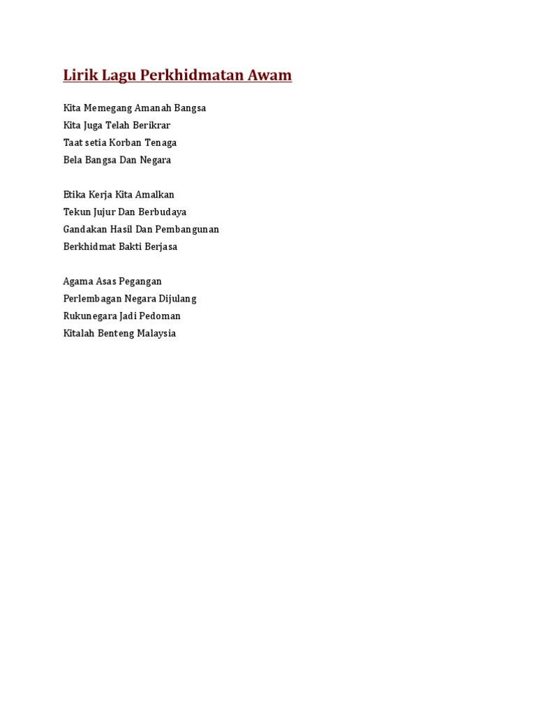 Blog lirik lagu ini tidak menyediakan sebarang link untuk download lagu mp3 dari samada dalam format mp3 atau sebarang format audio yang lain. Lirik lagu perkhidmatan awam. Agama asas pegangan perlembagan negara dijulang rukunegara jadi pedoman kitalah benteng malaysia. Etika kerja kita amalkan tekun jujur dan berbudaya gandakan hasil dan pembangunan berkhidmat bakti berjasa.