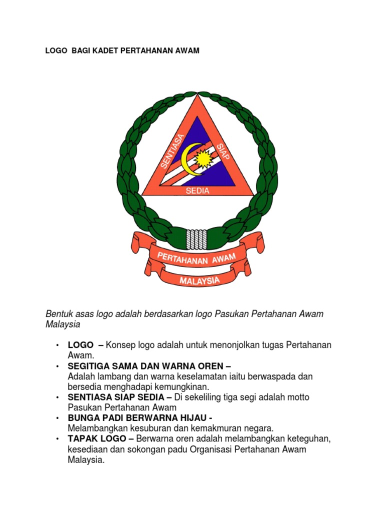 Maksud logo angkatan pertahanan awam. Kuasa menteri 3 1 menteri boleh membuat apa apa kaedah yang didapati perlu dan bermanafaat bagi pertahanan awam. Melakukan kerja bantuan bencana atau memberi perlindungan bagi menjamin keselamatan nyawa orang atau harta benda penduduk awam sekiranya berlaku atau akan berlaku bencana serta memudahkan pemulihan mangsa selepas bencana tersebut. Pertahanan dan keselamatan angkatan pertahanan awam malaysia apm update2019. Jalan maktab perguruan islam sungai merab 43000 kajang selangor darul ehsan malaysia.