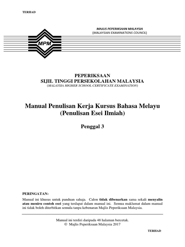 Terhad manual kerja kursus 3 terhad 1 pengenalan setiap calon sijil tinggi persekolahan malaysia stpm wajib melaksanakan kerja kursus bagi mata pelajaran bahasa melayu. Perkongsian ilmu bahasa melayu upsr pt3 spm dan stpm. Markah kerja kursus ini akan diambil kira bersama sama dengan markah ujian bertulis semester 1 2 dan 3 bagi tujuan penggredan mata pelajaran. Berikut merupakan perkongsian saudari tanushah dalam blognya thanushahsoniyasee96 berkaitan bagaimana kertas kerja kursus bahasa melayu tingkatan 6 penggal 3 dilaksanakan.
