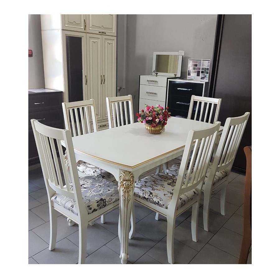 Meja makan putih 4 kursi desain khas eropa dengan menonjolkan warna putih dan natural warna kayu.