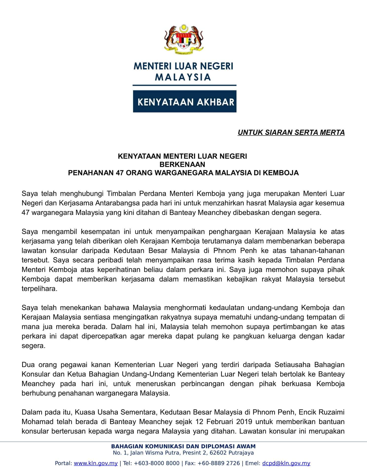 Menteri luar negeri malaysia 2019. 03 11 2020 malaysia strongly condemns the gunmen attacks in vienna austria. The ministry of foreign affairs of the republic of indonesia is a government ministry responsible for the country s foreign politics. The name changed due to the new law about state ministry of 2008. Halaman ini terakhir diubah pada 30 oktober 2020.