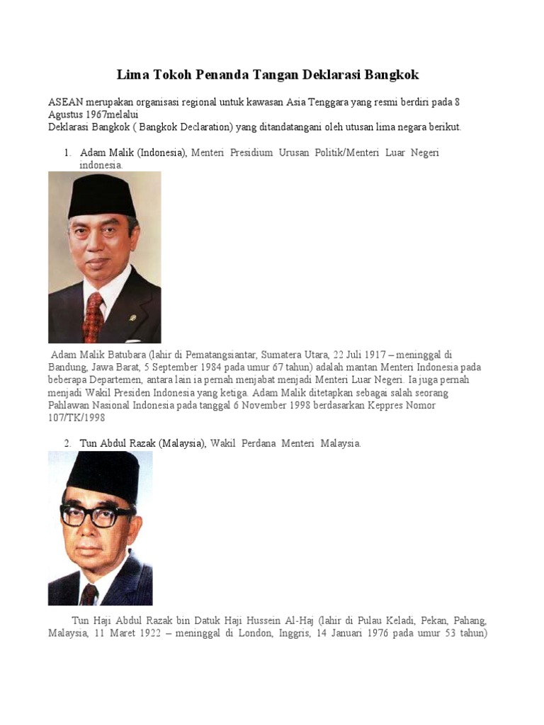 Para menteri luar negeri yang menandatangani deklarasi bangkok yakni adam malik dari indonesia narsisco ramos dari filipina raja ratnam dari singapura thanat khoman dari thailand dan tun abdul razak dari malaysia. Adapun negara yang turut serta dalam pertemuan di bangkok ini adalah indonesia malaysia singapura filipina dan thailand. Tun abdul razak wakil perdana menteri malaysia 3.