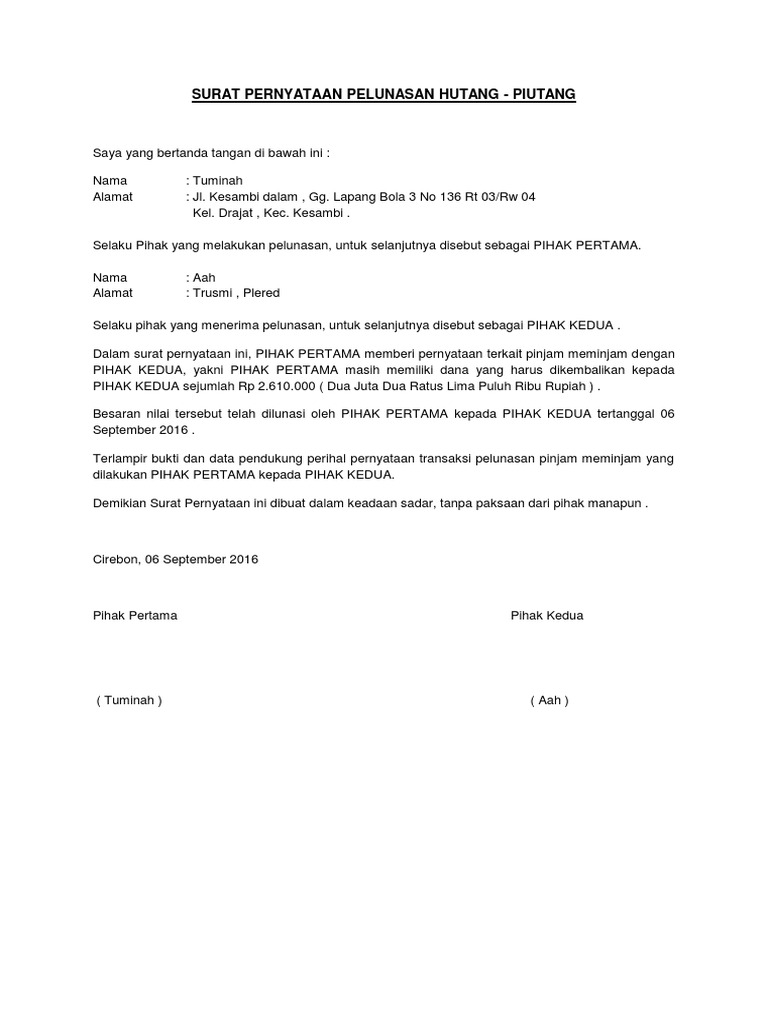 Contoh surat perjanjian pelunasan hutang pihutang atau utang banyak sekali di antaranya adalah pelunasan pembelian tanah rumah property kendaraan mobil dan barang barang lainnya yang bernilai tinggi yang terkadang pembeli butuh waktu untuk melunasinya. Jakarta 15 mei 2018 pihak pertama pihak kedua zarkasi simanjuntak ahmad rusli. Demikianlah surat pernyataan pelunasan dibuat dalam keadaan sehat dan tanpa paksaan. Mengakui bahwa telah menerima pelunasan pembayaran seperti yang dimaksud diatas.