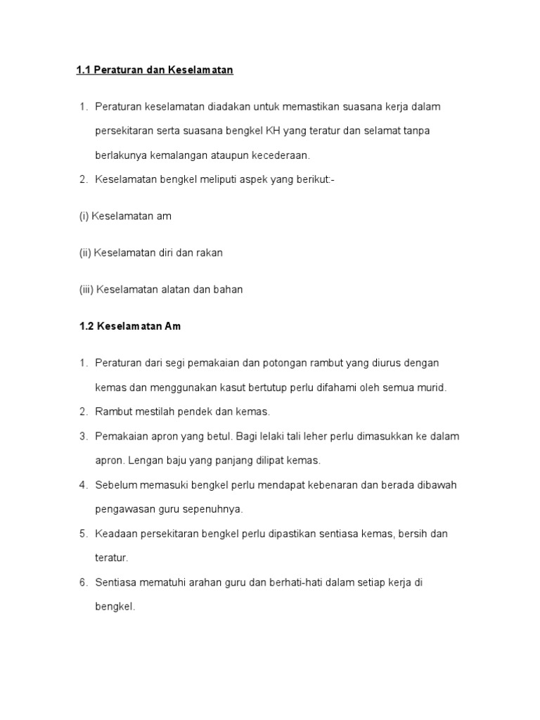 Pengenalan keselamatan di bengkel. Struktur dan bentuk organisasi yang berbeza beza dari segi dalaman atau luaran bukan ukuran di mana amali bagi pengajaran dan pembelajaran kemahiran hidup tetap berjalan. 1 1 0 pengenalan pusat bagi amali pengajaran dan pembelajaran subjek kemahiran hidup adalah di dalam bengkel kemahiran hidup. Selain itu peraturan keselamatan di dalam bengkel juga disediakan untuk menghindarkan kemalangan selain menyemai sikap tanggungjawab dalam kalangan murid. Peraturan keselamatan di dalam bengkel terbahagi kepada tiga bahagian iaitu.