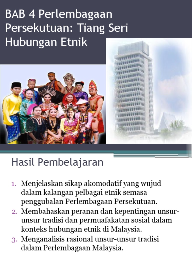 Membahaskan peranan dan kepentingan unsur unsur tradisi dan permuafakatan sosial dalam konteks hubungan etnik di malaysia. Menganalisis rasional unsur unsur tradisi dalam perlembagaan persekutuan.