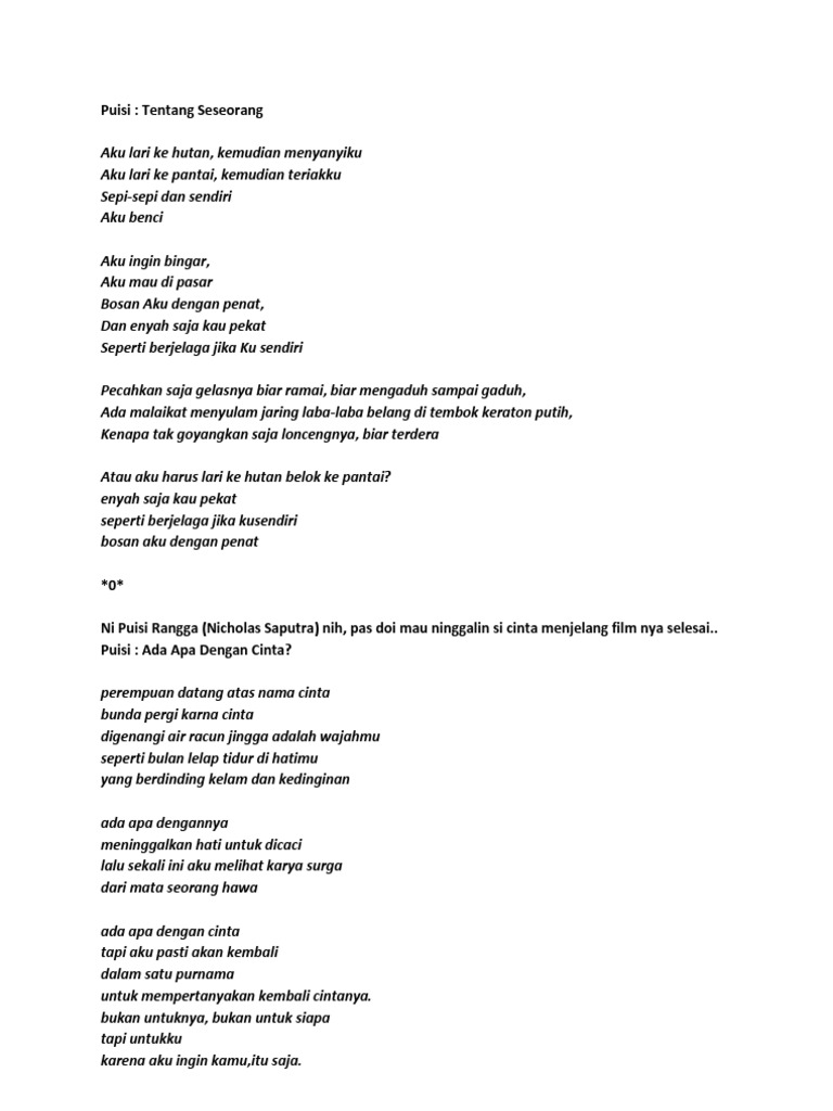 Kumpulan puisi dalam ost. Puisi ada apa dengan cinta masih ingat dengan film ada apa dengan cinta atau yang kita kenal aadc. 12 november 2009 pukul 1 29 pm balas.