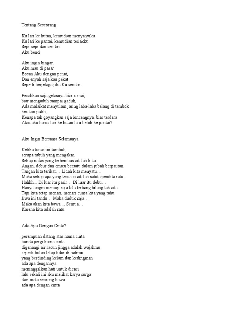 Kulari ke hutan kemudian menyanyiku kulari ke pantai kemudian teriakku sepi sepi dan sendiri aku benci ingin bingar aku mau di pasar bosan aku dengan penat enyah saja engkau pekat seperti berjelaga jika kusendiri pecahkan saja gelasnya biar ramai biar mengaduh sampai gaduh ada malaikat menyulam jaring laba laba belang ditembok keraton putih. Kulari ke hutan kemudian menyanyiku. Ia langganan juara lomba puisi di sekolahnya yang rutin diadakan tiap tahun. Ada apa dengan cinta.