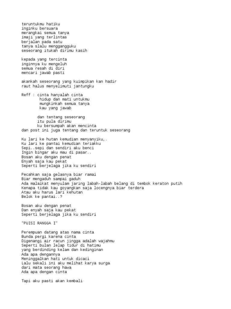 Puisi ada apa dengan cinta masih ingat dengan film ada apa dengan cinta atau yang kita kenal aadc. Rako prijanto ketika tunas ini tumbuh serupa tubuh yang mengakar. Kulari ke pantai kemudian teriakku. Masih ingat puisi rangga dan cinta di film ada apa dengan cinta puisi rangga aadc kulari ke hutan pengertian puisi adalah suatu karya sastra tertulis dimana isinya merupakan ungkapan perasaan seorang penyair dengan menggunakan bahasa yang bermakna semantis serta mengandung irama rima dan ritma dalam penyusunan larik dan baitnya.
