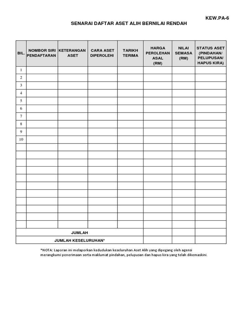 Senarai daftar aset alih bernilai rendah. Jumlah keseluruhan adalah nilai perolehan asal aset yang masih dalam. Perkataan h harta modal hendaklah digantikan dengan aset alih bernilai rendah r. Kew pa 5 dan kew pa 6 hendaklah dikemas kini apabila terdapat aset alih baharu aset alih dilupus atau aset alih dihapus kira. Kod nasional kategori sub kategori jenis harga perolehan asal kuantiti tarikh diterima unit pengukuran no.