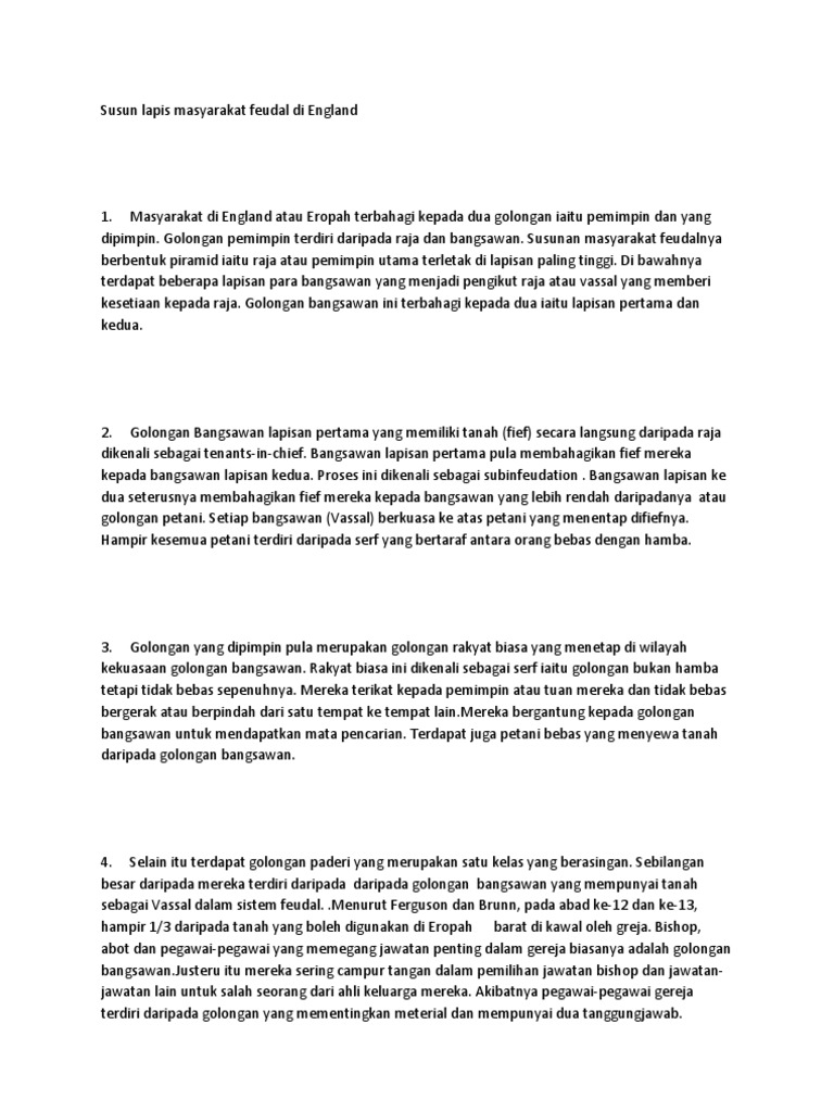 Susun lapis masyarakat feudal di england. Golongan pemimpin terdiri daripada raja bangsawan iaitu baron dan knight. Susun lapis masyarakat feudal di england. Masyarakat feudal boleh dibahagikan kepada dua golongan iaitu golongan pemimpin dan golongan yang dipimpin golongan pemimpin terdiri daripada raja pembesar bangsawan dan golongan yang dipimpin ialah rakyat atau petani. Masyarakat feudal di england mempunyai struktur masyarakat yang tersendiri dan mengalami perubahan berikutan perkembangan perdagangan kestabilan politik dan kemunculan bandar baru.
