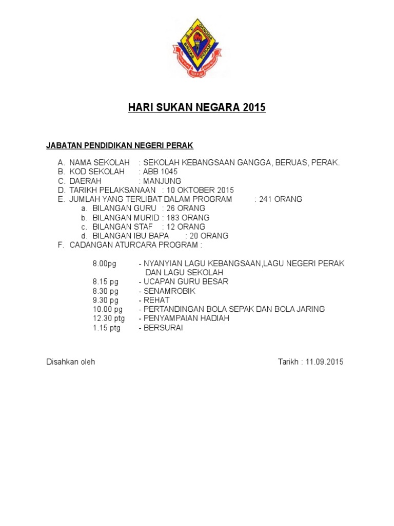 Ucapan wakil komuniti taman bukit en. Kertas kerja hari sukan negara 2015 lampiran 1 tentatif program 10 oktober 2015 sabtu masa aktiviti 7 20 pagi murid guru dan staf berkumpul di dewan puteri emas sk sab 2 muar 7 30 pagi pendaftaran peserta 8 00 pagi senamrobik 1malaysia 9 00 pagi sukaneka tahap 1 dan 2 10 00 pagi rehat 10 30 pagi indoor game futsal antara rumah pasukan 11 30 pagi aktiviti mewarna hari sukan negara tahap. 10 oct 2015 jam. Sambutan hsn telah diumumkan oleh yang amat berhormat dato sri mohd.