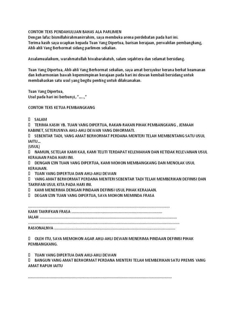 Perdana menteri teks bahas. Cikgu saya ni baru cuba masuk prtandingan bahas di sekolah. Hehe jadi bacalah hasil air tangan saya. Rangka karangan kata alu aluan pendahuluan tolak pindaan usul oleh pembangkang sokong definisi usul perdana menteri isi isi penting i.