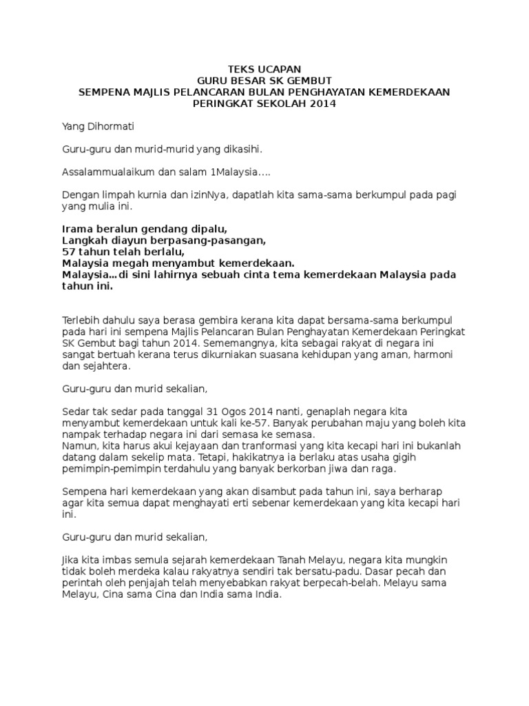 Teks ucapan sambutan hari kemerdekaan peringkat sekolah hai teringat pulak masa kat sksp dulu pernah dapat peluang jadi mc. Syukur alhamdulillah kita dapat berkumpul pada majlis sambutan ambang merdeka peringkat sekolah tahun 2012. Teks ucapan pelancaran bulan kemerdekaan peringkat sekolah 2014 norlinordin skpjp2014 oleh. Satu jamuan makan tengah hari telah diadakan di kantin sekolah.